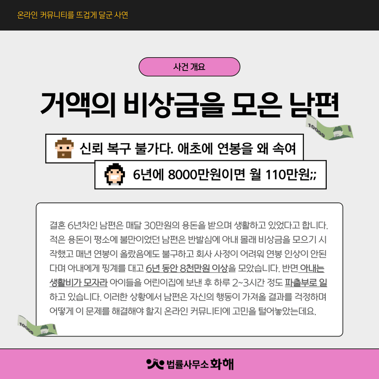 부부 사이라도 남편 몰래 혹은 아내 몰래 비상금을 모으는 분들이 계실 텐데요. 서로 한 이불을 덮고 자는 가까운 관계라 할지라도, 예기치 못한 상황에 대비하거나 부모님 용돈을 드리는 등 개인적인 용도로 요긴하게 사용할 자신만의 비상금이 필요하기 마련이죠. 하지만 그 금액이 과도하게 커진다면 부부간의 신뢰 관계에서 문제가 될 수도 있습니다. 최근 한 온라인 커뮤니티에서 아내 모르게 6년간 연봉을 숨기고 8천만원의 비상금을 모은 남편의 사연이 화제가 되고 있는데요. 오늘은 과도한 비상금이 부부생활에 미칠 수 있는 법적 영향에 대해 살펴보고자 합니다.