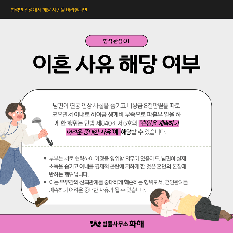 먼저 연봉 인상 사실을 숨기고 8천만원이라는 비상금을 따로 모으면서도 아내로 하여금 생계비 부족으로 파출부 아르바이트를 하게 한 남편의 행위는 민법 제840조 제6호의 "혼인을 계속하기 어려운 중대한 사유"에 해당할 수 있습니다. 부부는 서로 협력하여 가정을 영위할 의무가 있음에도 불구하고, 남편이 실제 소득을 숨기고 아내를 경제적 곤란에 처하게 한 것은 혼인의 본질에 반하는 행위이기 때문입니다. 또한 남편의 이 같은 행위는 부부간의 신뢰 관계를 중대하게 훼손하는 행위로서, 혼인 관계를 계속하기 어려운 중대한 사유가 될 수 있습니다.