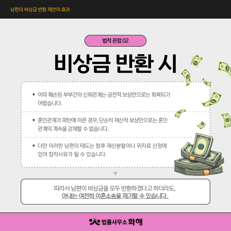 만약 남편이 비상금 8천만원을 모두 아내에게 반환하겠다고 하더라도, 이미 훼손된 부부간의 신뢰 관계는 금전적 보상만으로는 회복되기 어려울 수 있습니다. 법적인 관점에서 보았을 때 혼인 관계가 파탄에 이른 경우, 단순히 재산적 보상만으로는 혼인 관계의 계속을 강제할 수 없기 때문인데요. 따라서 남편이 비상금을 모두 반환하겠다고 하더라도, 아내는 여전히 이혼소송을 제기할 수 있습니다. 다만 잘못을 인정하고 비상금을 모두 아내에게 돌려주겠다는 남편의 태도는 향후 재산분할이나 위자료 산정에 있어 참작 사유가 될 수 있습니다.
