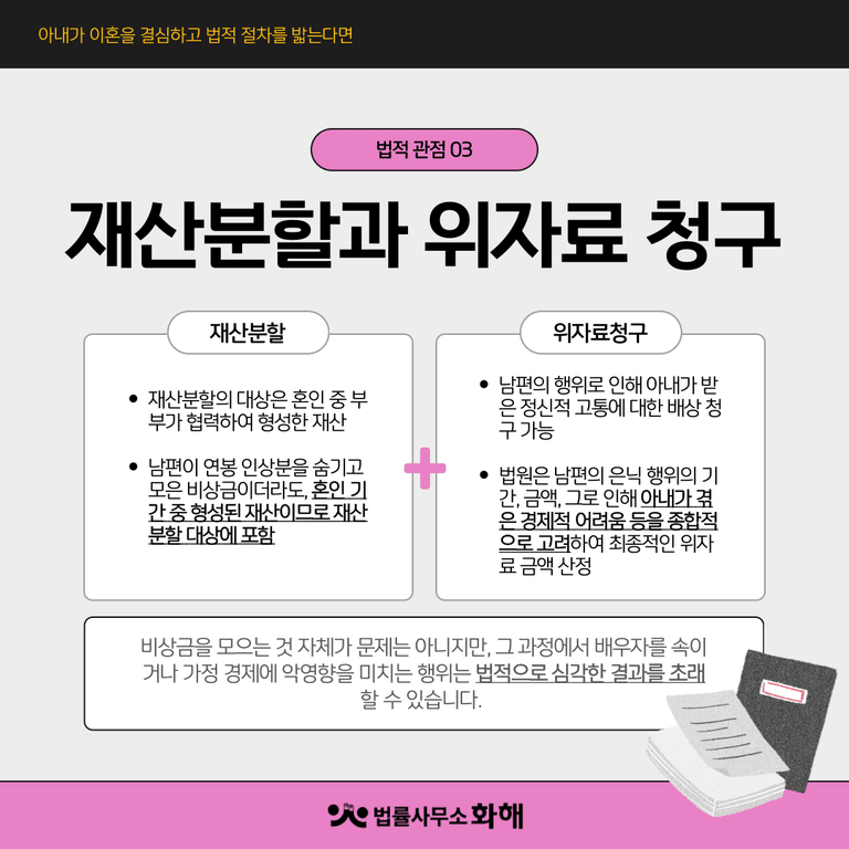 만약 아내가 이혼을 결심하고 법적 절차를 밟는다면, 남편을 상대로 재산분할과 위자료 청구도 고려해 볼 수 있습니다. 재산분할의 경우, 혼인 기간 동안 부부가 공동으로 형성한 재산이 대상이 됩니다. 이때 법원은 각 배우자의 기여도, 혼인 기간, 연령, 직업 능력 등을 종합적으로 고려하여 공정한 분할을 결정합니다. 그렇기 때문에 혼인 기간에 형상된 자산이라 할 수 있는 8천만원의 비상금도 당연히 분할 대상에 포함됩니다. 또한 위자료 청구는, 남편의 행위로 인해 아내가 받은 정신적 고통에 대한 배상을 청구할 수 있는데요. 법원은 남편의 은닉 행위의 기간, 금액, 그로 인해 아내가 겪은 경제적 어려움 등을 종합적으로 고려하여 최종적인 위자료 금액을 산정하게 됩니다.