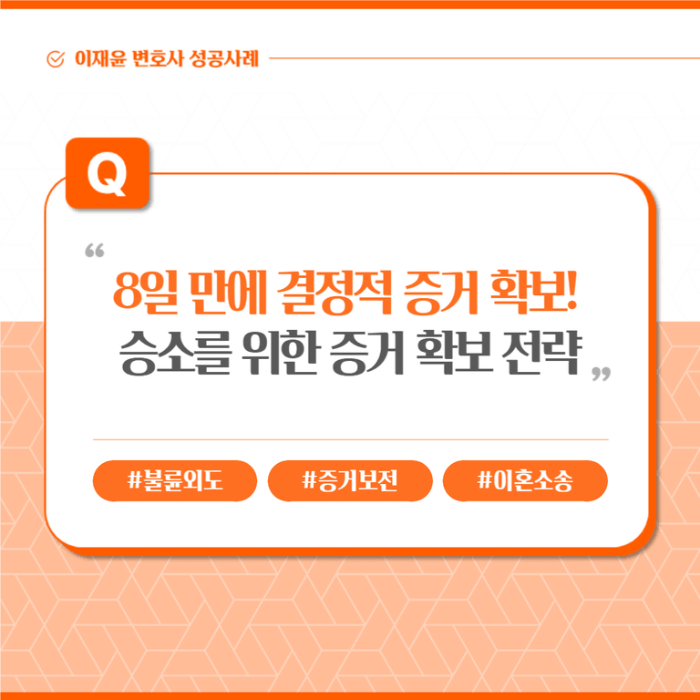 그러나 증거보전 결정을 위해서는 ‘상간 행위가 존재하였다’는 사실을 증명해야 하며, 본안 소송에서 만큼의 증명은 필요 없지만 적어도 부정행위를 의심할 만한 문자나 전화 내역 등은 확보해야 합니다. 이 사건에서는 의뢰인이 직접 블랙박스에서 확인했던 기억 외에는 증거가 없는 상황이었습니다.