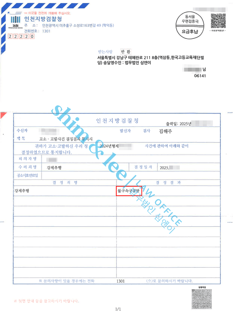 - 심앤이는 고소 전부터 사건을 철저히 계획, 진행하여 경찰로부터 송치 결정을 받았습니다. 이에 멈추지 않고 사건의 정식 기소를 위해 피해자의 엄벌 탄원서 작성, 변호사의 구공판 의견서를 제출 등 사건의 향후 절차도 면밀히 계획하였습니다.