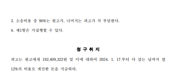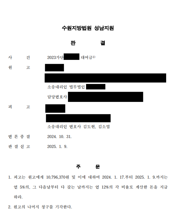 상대방은 처음 4억원을 주장하다가 몇 번 청구취지를 변경하였고, 최종적으로 1억 9천만원 상당의 대여금을 주장하였습니다. 우리는 상대방이 주장하는 금원 대부분은 지급이 되었다는 점을 의뢰인의 통장내역을 바탕으로 상세히 주장하였고, 최종적으로 1억 8천만원을 방어하여 실제 지급액은 1천만원 상당이고, 추후 소송비용확정신청을 통해 소송비용을 반환받으면 몇 백만원만 지급하는 것으로 정리할 수 있는 결과를 얻었습니다.
