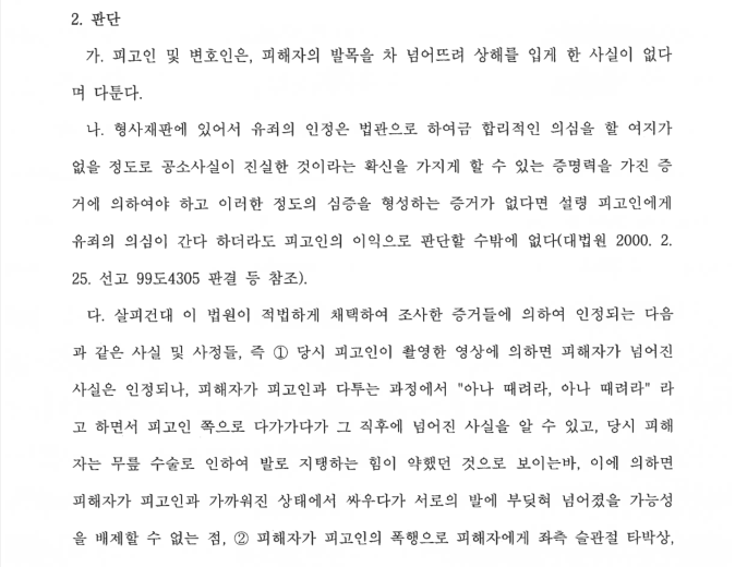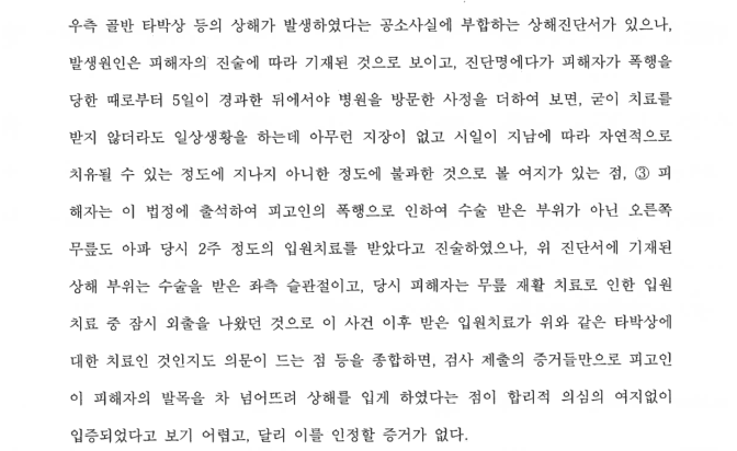 이처럼 피해자의 진술에만 입각하고 과장된 상해진단서에 근거해서 수사가 진행되는 관행들은 사라졌으면 합니다. 다행히 재판부에서는 이런 말도 안되는 상해진단서의 신빙성을 배척하여 상해혐의에 대해 무죄를 선고해주었습니다.