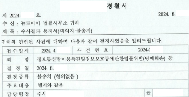 3. 최종 결과 - 네이버카페 명예훼손, 특정성 부정으로 불송치 방어성공