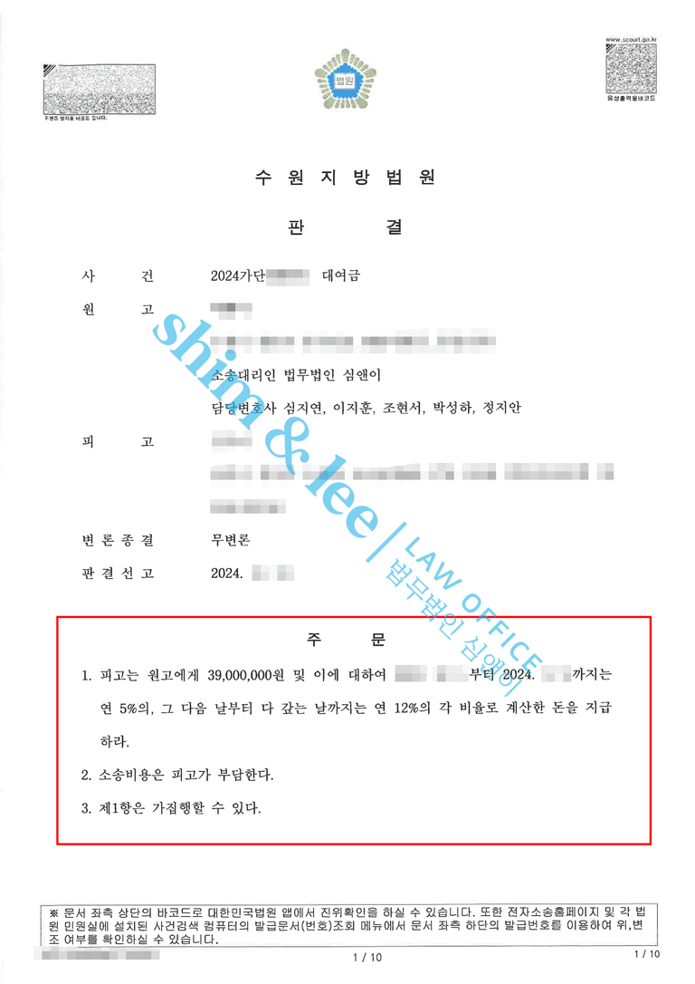-피고는 소장을 받고 답변서 미제출로 아무런 대응을 하지 않아 무변론판결 선고로 소송은 빠르게 진행되었고, 판결선고기일에는 심앤이가 주장한 변제기와 지연이자 기산점이 모두 인정되었습니다.