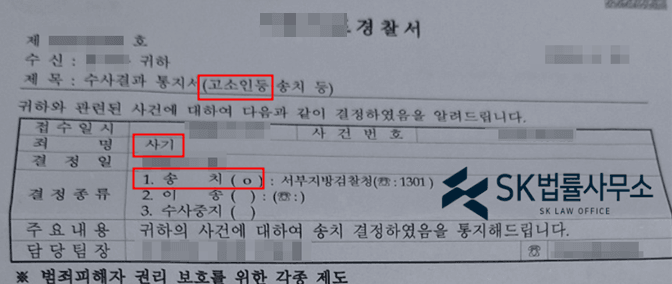 경찰은 본 변호인의 의견을 받아들여 피고소인에 대하여 검찰 송치 결정하였습니다.SK 법률사무소의 강점