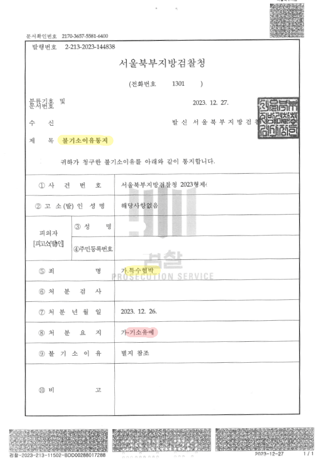 서울북부지방검찰청은 변호인의 의견을 수용하여 기소유예 처분을 하였음.
