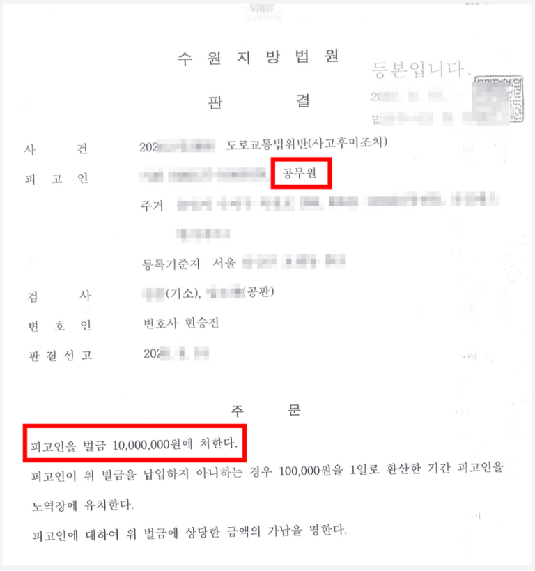 변호인의 이런 효율적인 변론 전략 수립과 시행 덕분에 검찰에서는 의뢰인에 대한 도주치상 혐의에 대해서는 혐의없음 처분을 하였고, 법원에서는 인정되는 혐의인 사고후미조치에 대해서 벌금형의 선처를 함으로써 의뢰인은 직업을 잃는 일을 피할 수 있었습니다.