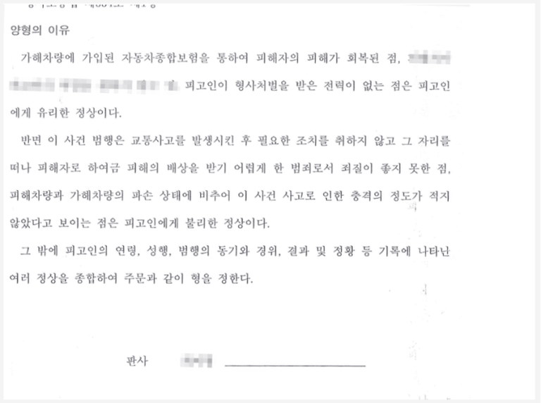 또한 변호인은 피할 수 없는 죄명인 도로교통법위반(사고후미조치)의 점에 대해서는 사건의 경위나 사건 이후 의뢰인의 반성과 재범방지 노력 등에 비추어 선처가 필요하다는 점을 적극적으로 주장·입증하였습니다.