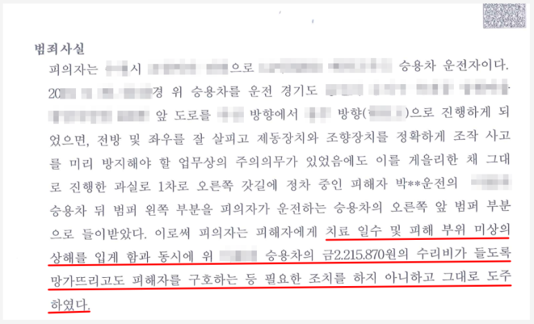 흔히 뺑소니라고 하는 '특정범죄가중처벌등에관한법률위반(도주치상)' 혐의가 기소되어 유죄로 인정되는 경우에는 징역형을 피하기 어려웠으므로 변호인은 이를 제외하기 위해서 피해자에게 사죄하고 적절한 배상을 하면서 도움을 줄 것을 요청했습니다.