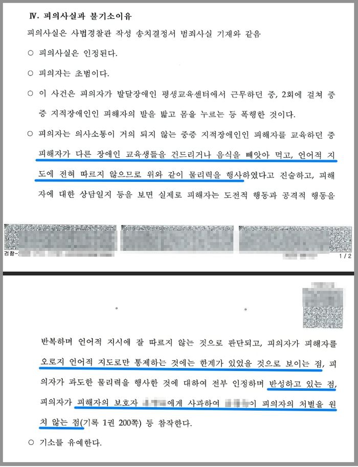 변호인은 경위와 무관하게 의뢰인의 행동은 잘못된 것이고 이에 대하여 의뢰인도 깊이 뉘우치고 있다는 점을 밝히면서, 다만 특수교사들이 근무 과정에서 겪는 수많은 어려움, 의뢰인이 잘못된 행동을 하게 된 경위 등에 대해서 적극적으로 고려하여 줄 것을 검사에게 요청하였습니다.