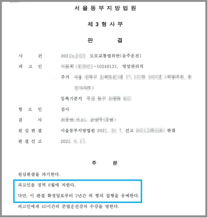 *의뢰인이 음주운전으로 집행유예를 선고 받은 판결