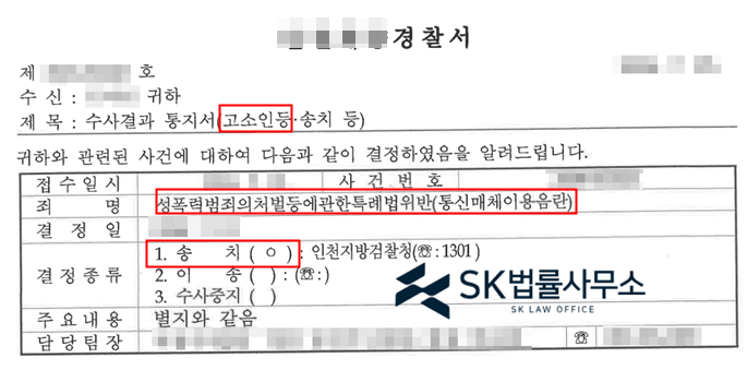 경찰은 본 변호인의 주장을 받아들여 성폭력범죄의처벌등에관한특례법위반(통신매체이용음란) 혐의에 대해 검찰 송치 결정하였습니다.SK 법률사무소의 강점