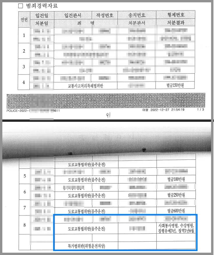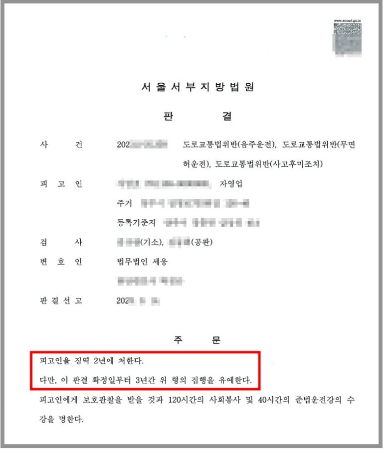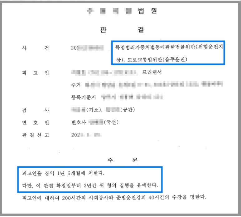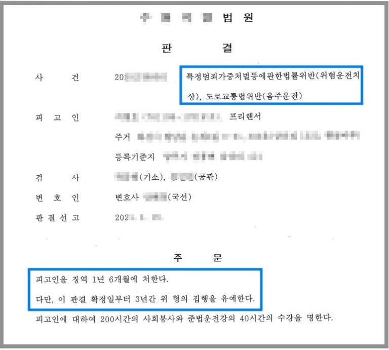 그런데 의뢰인은 이미 5회의 음주운전 전과가 있었고, 특히 이 사건이 발생하기 약 2년 전에 혈중알코올농도 0.242%의 만취상태에서 타인에게 상해를 입히는 교통사고를 발생시켜 징역 1년6월에 집행유예 3년을 선고받아 집행유예 기간 중에 있었습니다.