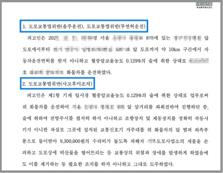 의뢰인은 음주운전으로 면허가 취소된 상태에서 술을 마시고 운전을 하다가 신호등을 들이받는 사고를 냈는데, 음주운전 및 위험운전치상으로 집행유예 기간 중이었기 때문에 처벌이 두려워 현장에서 도주하고 말았습니다. 그러나 목격자의 신고를 받고 집 앞에서 기다리던 경찰관에게 검거되었고 혈중알코올농도는 0.129%로 측정되었습니다.