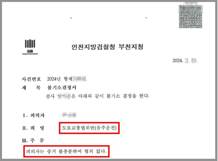 그러나 검사는 변호인의 주장을 인정하여 의뢰인의 운전 당시 혈중알코올농도가 단속기준치를 넘었다는 것을 증명할 수 없다는 이유로 혐의없음 처분을 하였고, 의뢰인은 처벌을 면함과 동시에 면허취소처분이 철회되어 곧바로 면허증을 돌려받을 수 있었습니다.