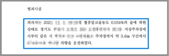 그러나 술에 취한 의뢰인이 경찰관들과 실랑이를 하는 사이에 30분의 시간이 경과하였고 의뢰인이 운전을 마친 후 약 30여분 후에 음주측정이 이루어졌습니다. 그 결과 의뢰인의 혈중알코올농도는 0.034%로 측정되었습니다.
