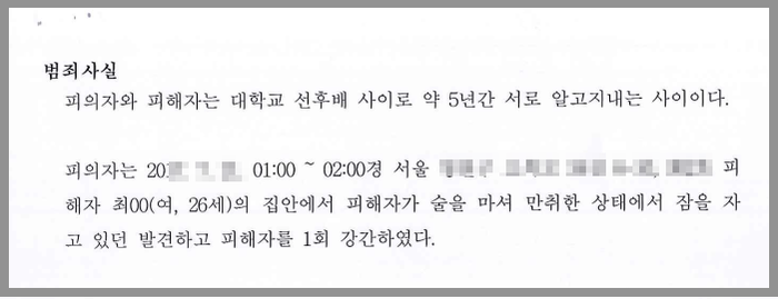 의뢰인은 모 병원에서 의료기사로 일하고 있는 사람이었는데, 오랜만에 대학 후배인 피해자를 만나 함께 술을 마시게 되었습니다. 이후 의뢰인과 피해자는 피해자의 집에서 추가로 술을 마셨고 이후 피해자는 술에 취해 잠들었습니다. 그런데 의뢰인은 술에 취한 상태에서 순간적으로 잘못된 판단을 하여 피해자의 의사에 반하는 관계를 가졌고 다음날 피해자로부터 고소를 당하였습니다.