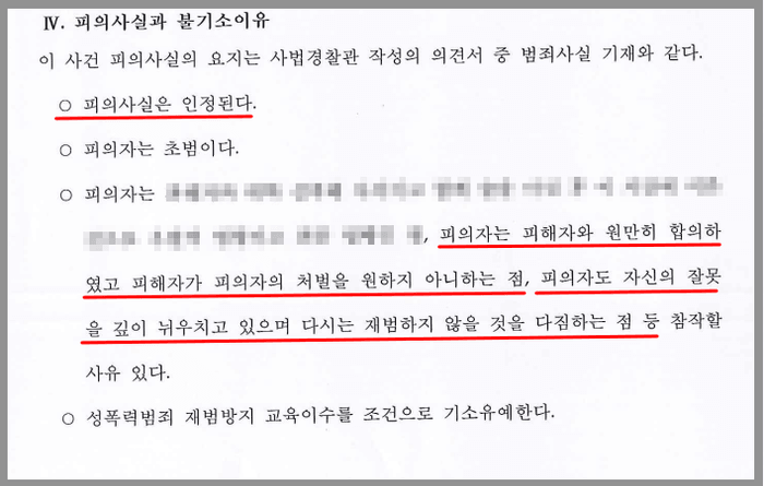 그리고 이와 같이 피해자와 원만히 합의하여 용서를 받은 점, 의뢰인이 진심으로 뉘우치고 있는 점, 다시는 같은 잘못을 되풀이 하지 않기 위해서 각고의 노력을 하고 있는 점 등을 바탕으로 의뢰인에 대하여 기소유예 처분을 하여줄 것을 청하였습니다.