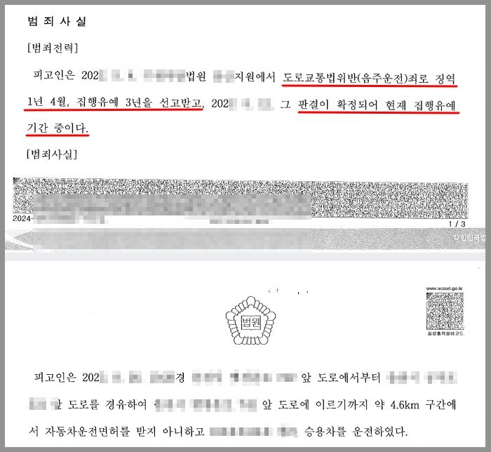 그런데 앞서 언급한 음주운전 전력으로 인하여 징역 1년4월에 집행유예 3년을 선고받아 집행유예 기간 중에 있었음에도 면허가 취소된 상태에서 운전을 하다가 도로교통법위반(무면허운전)으로 또 다시 적발되었고, 제1심(원심)에서 징역 6개월을 선고받고 법정구속 되었습니다.