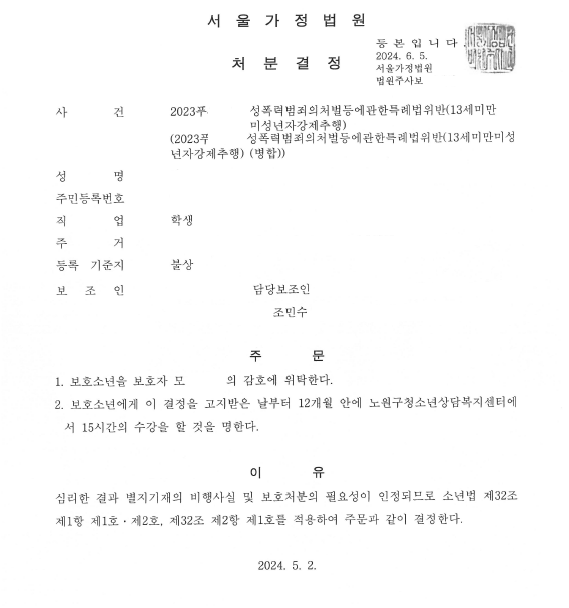 서울가정법원에서는 변호인의 의견을 수용하여 소년심판에서 가장 낮은 처분인 소년보호처분 제1호, 제2호 처분을 하였음.