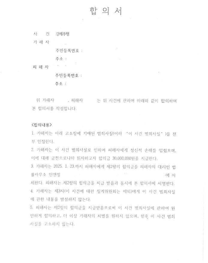 우선적으로 가해자에게 해당 고소장이 작성된 사실을 알리고 사실을 인정하는지에 대해 확인하였습니다. 피해자의 피해보상을 위해 합의금 역시 요청하였는데요. 의논 끝에 강제추행 합의금은 3천만원으로 정해졌습니다.