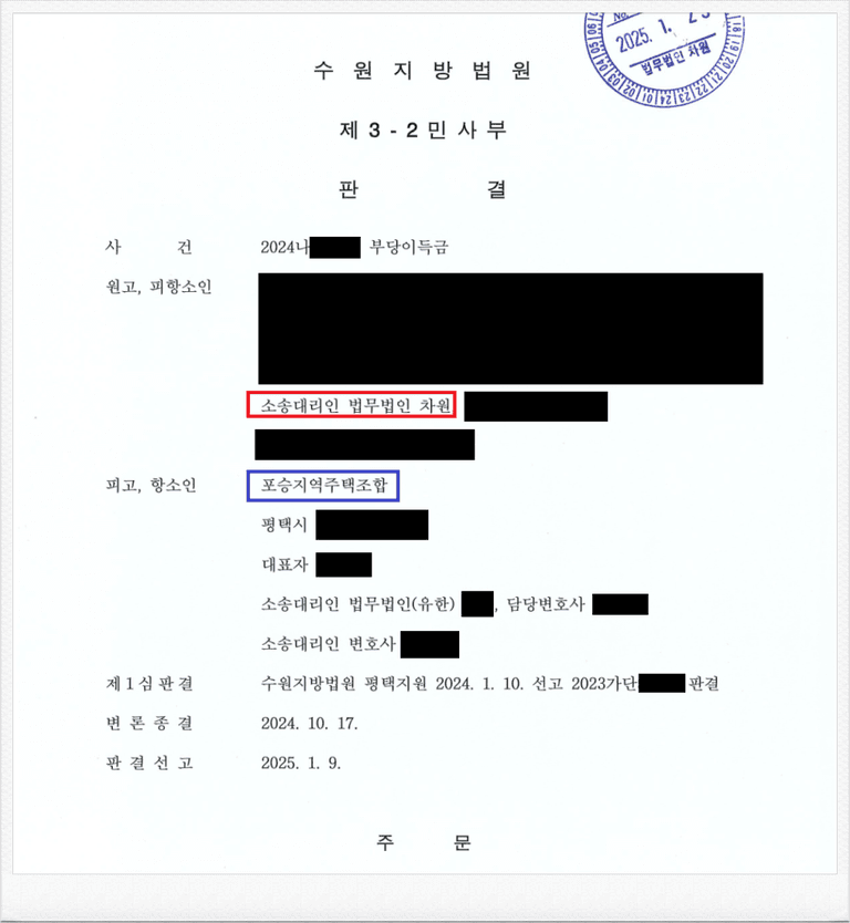 그런데, 가입 후 포승지역주택조합 측의 사업이 계획대로 진행되지 않았고, 이에 의뢰인은 정식 민사소송을 통하여 기 납입한 금원의 반환을 원하셨습니다.