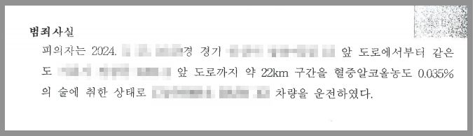의뢰인은 과거 음주운전으로 벌금형의 처벌을 받은 전력이 있었는데, 회사 워크숍에서 동료들과 술을 마시고 다음날 운전을 하여 귀가하던 중 경찰의 음주단속에 적발되었습니다. 적발 당시 함께 술을 마신 다른 동료들은 모두 음주 감지조차 되지 않았음에도 의뢰인은 0.035%의 수치로 도로교통법위반(음주운전)으로 적발된 것이었습니다.