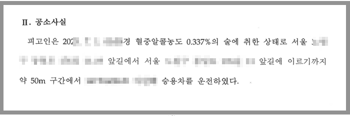 과거 전력이 비교적 오래 전의 것이었지만, 혈중알코올농도가 매우 높았기 때문에 검사는 의뢰인을 정식재판에 넘기는 구공판 처분을 하였고 그제야 사건의 심각성을 인지한 의뢰인은 변호인을 찾아오게 되었습니다.