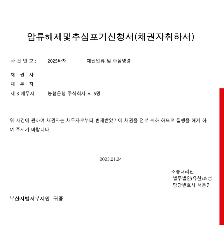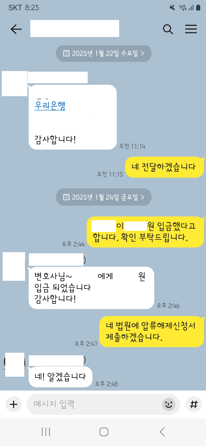 저는 즉각 입금 받은 자를 피고로 하여 민사소송 부당이득반환청구소송을 제기하였고 법원은 원고 승소 판결을 선고하여 확정 후 피고 재산에 압류 등 강제집행을 하였고 피고는 저희에게 연락하여 피해액을 반환할테니 압류를 풀어달라고 사정하여 의뢰인은 피해액을 반환받고 압류를 해제하였습니다.