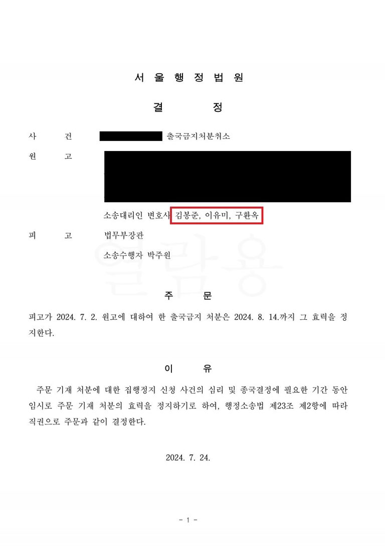 서울행정법원은 집행정지 신청에 대하여 변호인 주장을 전부 받아들여 출국금지 처분에 대해 출국 3일 전 그 처분의 효력을 정지하는 결정을 내렸습니다.