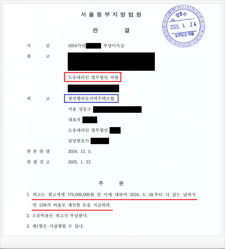 그러나, 가입 후 피고 광진벨라듀지역주택조합 측이 진행하는 사업이 계획대로 진행되지 않았고, 이에 의뢰인은 정식 민사소송을 통하여 기 납입한 금원의 반환을 원하셨습니다.