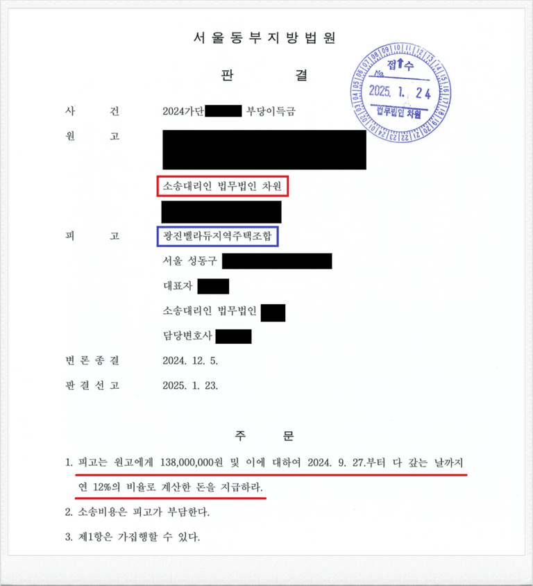 광진벨라듀지역주택조합을 상대로 한 분담금 반환 소송에서 다수의 승소 판결을 이끌어냈을 뿐만 아니라, 실제로 의뢰인의 납입금을 반환받는 성공적인 결과를 확보한 다양한 사례를 보유하고 있습니다. 이러한 성과를 바탕으로, 소송 의뢰 시 구체적인 승소 판결 및 환불 성공 사례를 제시하며, 지역주택조합 분담금 반환 소송에서 높은 성공 가능성을 실질적으로 입증하고 있습니다.