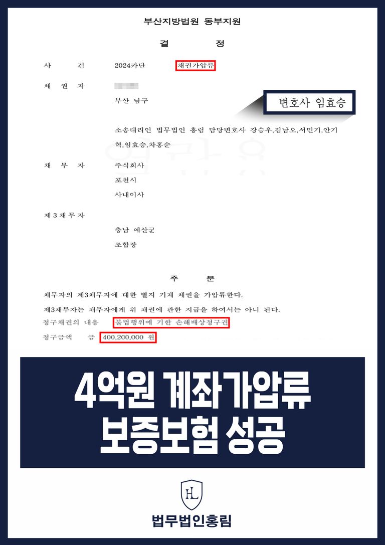 그 결과 법원에서는 본 변호인의 주장을 받아들여 통장 가압류(전액 보증보험)하였습니다.