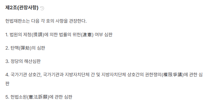 헌법재판소법 제2조에는 위헌법률심판, 탄핵심판, 정당해산심판, 권한쟁의심판, 헌법소원심판을 규정합니다. 위 다섯 가지가 헌법재판소의 핵심 역할입니다.