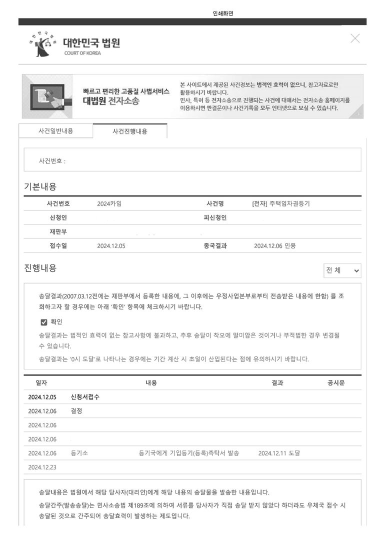 신청인의 이름이 등기사항증명서에 나오는데 신청서 접수 후 주말을 포함하여 7일이 걸리지 않았고 그 덕분에 의뢰인은 바로 HUG 주택도시보증공사를 통하여 임차보증금을 회수하고 새로운 보금자리에서 자리를 잡으셨다고 합니다.