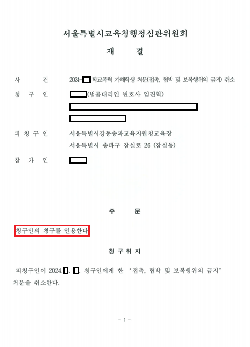 행심위는 밀친 행위와 관련된 부분이 'B학생에 대한 학교폭력에 해당하지 않는다'며 처분사유가 존재하지 않는다고 보았는데요. 행심위는 비방한 행위와 관련된 부분도 'B학생에 대한 가해사실이 인정되지 않는다'며 처분사유가 존재하지 않는다고 보았습니다. 결국, 위원회는 A학생의 심판청구에 대하여 조치처분 취소재결을 내렸습니다.