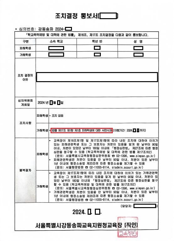 위원회는 그러한 사정을 반영하여 '가해학생에 대한 조치결정의 모든 판단요소'에 관하여 매우 낮은 점수를 부여하였는데요. 위원회는 그러한 점수를 적용하여 '1호부터 9호까지의 가해학생에 대한 조치사항' 중에서 가장 경한 조치를 의결하였습니다. 결국, 교육장은 B학생의 가해행위에 대하여 1호조치인 서면사과를 내렸습니다.