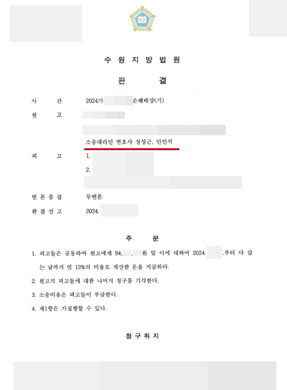 원고의 입장을 끝까지 대변하여 성공적인 손해배상 판결을 이끌어낸 사례입니다.