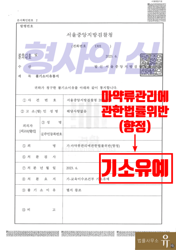 서울중앙지방검찰청은 법률사무소 유(唯)의 형사전문변호사가 작성한 변호인의견서 내용을 그대로 반영하여 의뢰인이 동종 범죄전력이 없는 점, 마약류 등 접근에 단순 호기심으로 인해 우발적으로 저질러진 측면이 있는 점은 물론 매수 및 투약의 정도가 비교적 중하다고 보기 어려운 점과 그럼에도 범행을 반성하며 스스로의 잘못을 진지하게 뉘우치고 있는 점, 피의자가 성실하게 마약류 예방 교육에 참여할 의사를 표시하여 적극적인 치료 의지가 있는 점 등을 이유로 ‘교육이수조건부 기소유예’ 처분을 하였습니다.