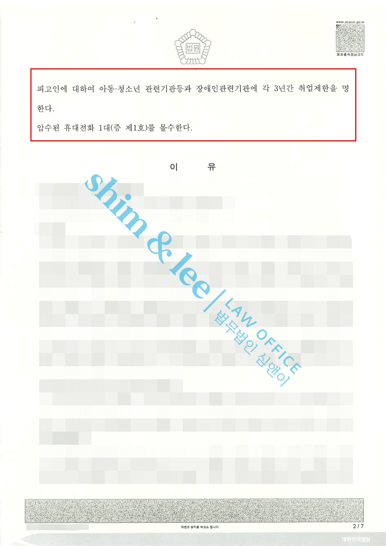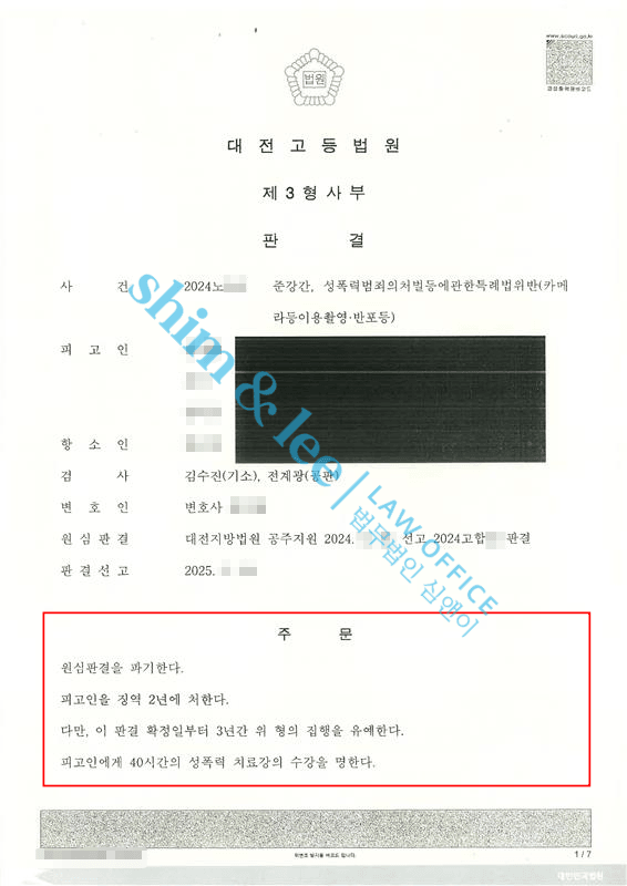- 합의 이후 항소심 재판부는 징역 2년, 집행유예 3년, 성폭력 치료강의 40시간, 취업제한 3년, 불법촬영을 한 휴대폰 몰수를 선고하였습니다.