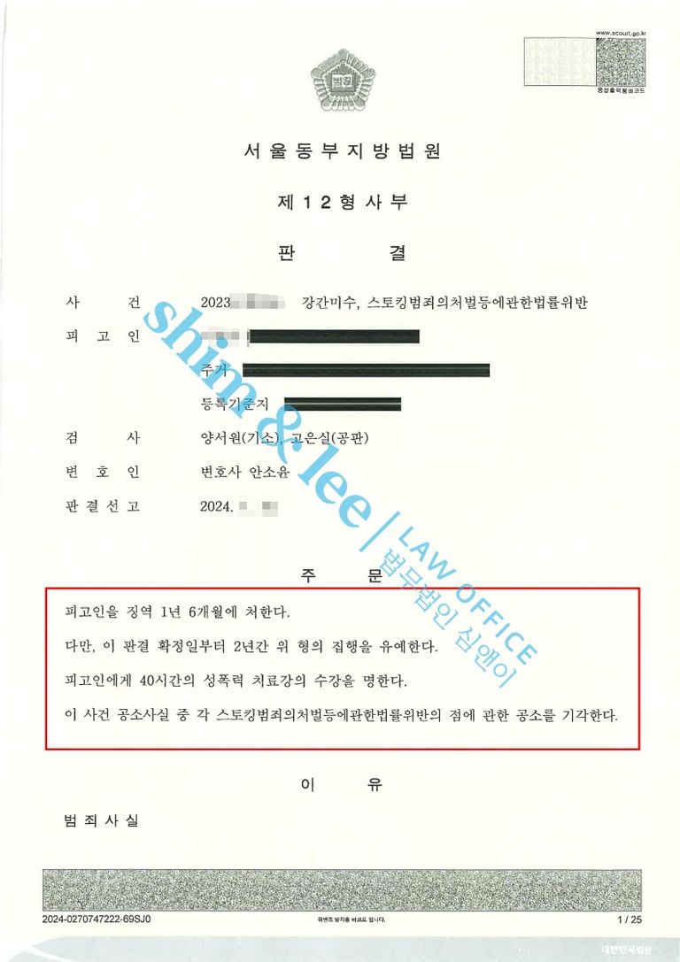 ③가해자는 수단과 방법을 불문하고 스토킹 행위를 무려 1년 간 반복적인 패턴으로 지속한 점을 강조하여 피해자는 가해자의 범행으로 극심한 정신적 고통을 겪고 있으며, 피해자뿐 아니라 가족과 지인들도 가해자에 대한 엄벌을 탄원하고 있다고 주장 했습니다.