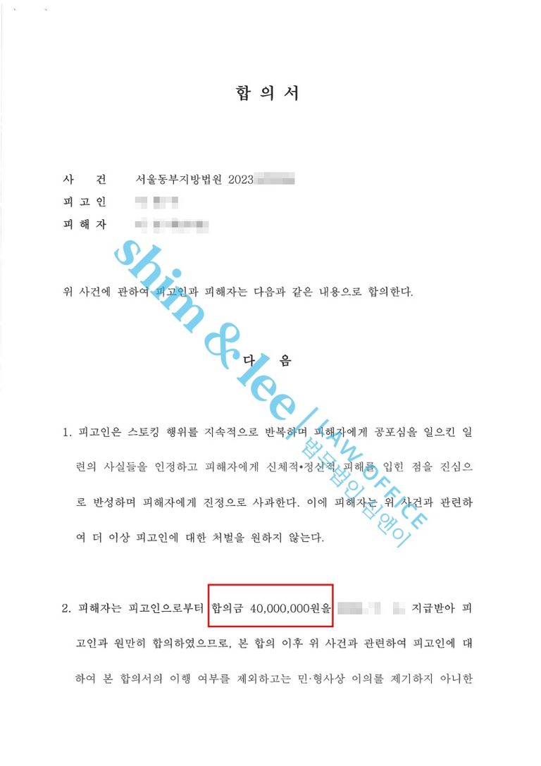 1. 가해자는 재판 단계에서도 강간미수 혐의를 부인하며 스토킹 혐의 일부만 인정하고 합의를 제안했습니다. 의뢰인은 가해자가 실형을 받더라도 자신을 평생 쫓아다닐 것 같아 두려움을 느끼셨고, 가해자와 완전히 관계를 끊고 싶다고 하셨습니다. 의뢰인의 의견을 반영하여 대표 변호사님은 가해자의 반성문을 받아낸 뒤 비밀 유지, 접근 및 보복 금지, 통신 제한 등의 조항과 위약벌을 포함한 합의서를 작성해 4천만 원에 합의를 진행했습니다. 또한, 재판부에는 가해자가 혐의를 부인하면서도 합의를 제안한 점과 피해자는 강간미수가 있었다는 주장은 변함이 없다고 전달했습니다.