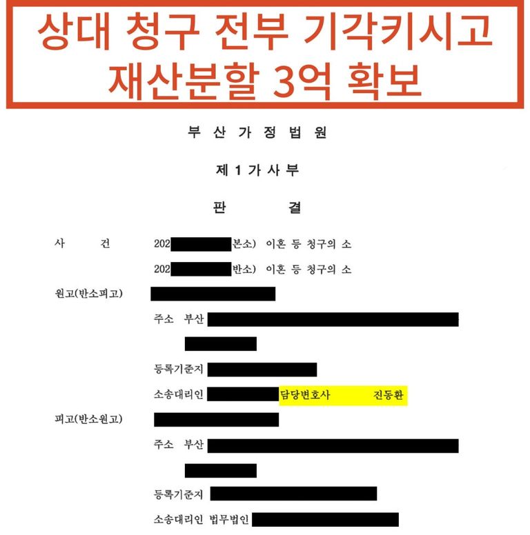 이를 통해 의뢰인은 아내의 청구를 전부 기각시키고, 3억 원을 상회하는 돈을 확보할 수 있었습니다.